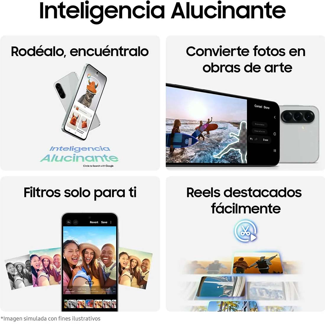 Galaxy A56 5G. Diseño para durar, pantalla más grande y envolvente, batería de larga duración. Inteligencia asombrosa Circle to Search con Google está disponible en el Galaxy A56. Solo tienes que rodear, resaltar o tocar un objeto o texto en la pantalla para obtener los resultados de Google Search. Fotos excelentes con la cámara mejorada de 50 MP que identifica el cielo, la piel, la cara, el pelo, la hierba y mejora la calidad de imagen para ti al instante. Un dispositivo pensado para quienes buscan lo mejor en su día a día, sin compromisos.