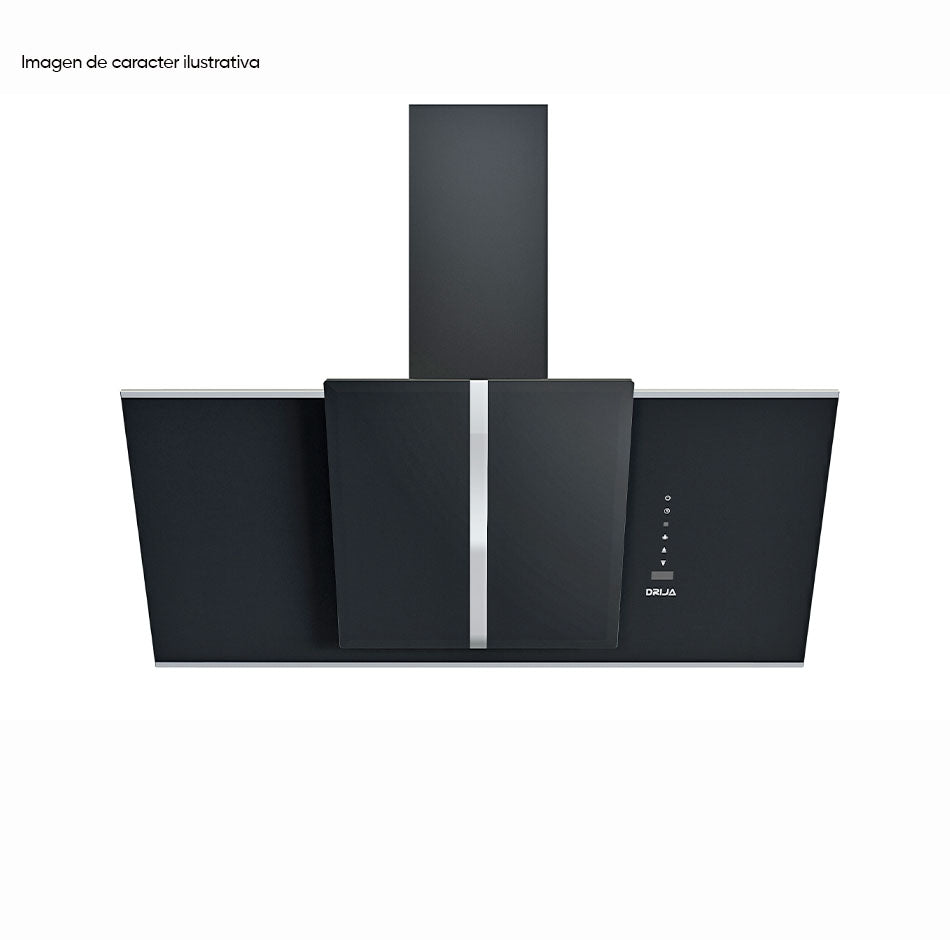 Extractor de grasa Drija modelo Triangulo 76, para eliminar grasa en el aire, productos de combustión, humos, humo, olores, calor y vapor del aire mediante la evacuación y filtración del aire. Está diseñado con un hermoso acabado en vidrio negro con bordes de acero inoxidable es una valiosa adición a cualquier cocina, proporcionando una extracción efectiva, mejorando la calidad del aire y creando un entorno de cocina más limpio.